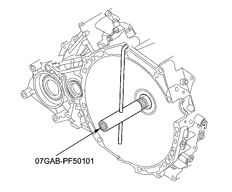 18. With SH-AWD: Install the transfer output shaft (C) in the torque converter housing, and install the thrust shim (D) on the top of the transfer output shaft.