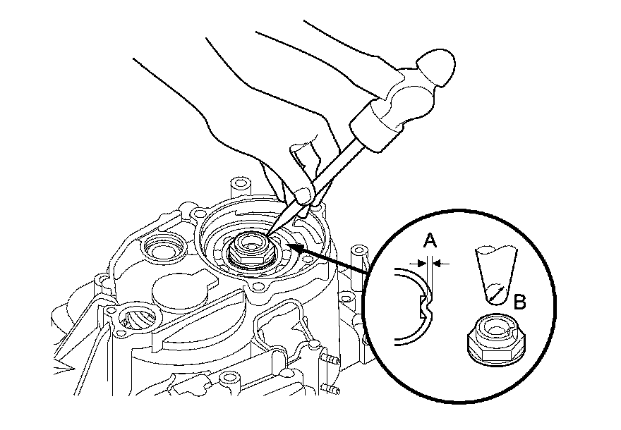 43. Install a new locknut, and tighten it to 178 Nm (18.2 kg-m, 132 lb-ft), then stake the locknut to a depth (A) of 0.7-1.3 mm (0.03-0.05 in) using a 3.5 mm punch (B).