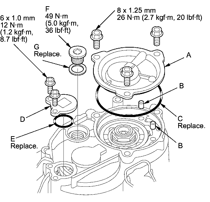 46. Apply thread lock sealant to the threads of the sealing plug (F), and install the sealing plug and a new sealing washer (G).