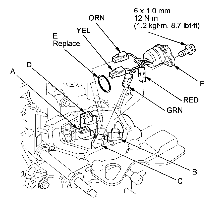 47. Install a new O-ring (E) on the shift solenoid wire harness (F).