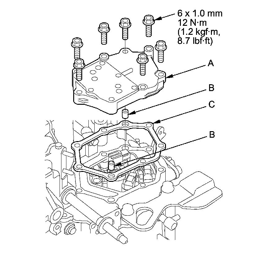 51. Install the solenoid valve cover (A) with the two dowel pins (B) and a new gasket (C), and secure it with the seven bolts.