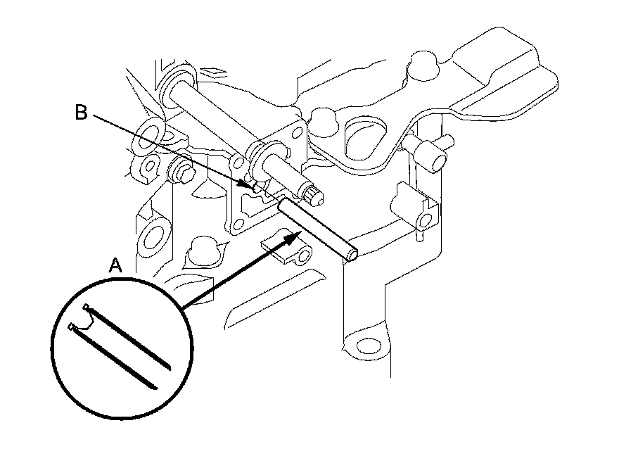 60. Set the transmission range switch (A) to the N position. The transmission range switch clicks in the N position, and the selector control shaft hole (B) aligns with the N positioning line (C).