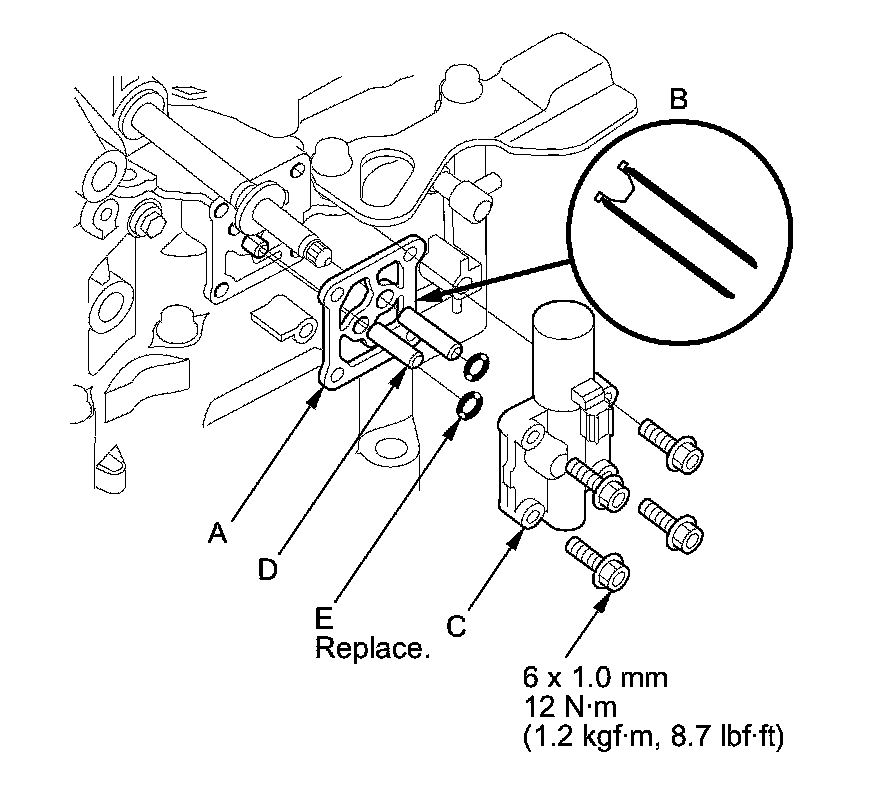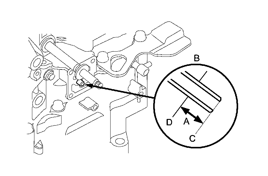 55. Check the height (A) of the 8 x 53 mm ATF joint pipe (B) between the top (C) of the pipe and the solenoid valve body mounting surface (D). The height is about 7.0 mm (0.28 in). If the height is over 7.0 mm(0.28 in), install the pipe securely until it stops the accumulator body.