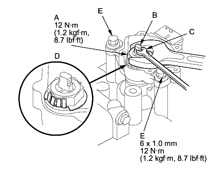 63. Push the locknut against the transmission housing to seat the transmission range switch into the selector control shaft, and tighten the locknut (A) to 12 Nm (1.2 kg-m, 8.7 lb-ft) while holding the selector control shaft (B) with a 6 mm wrench (C), then bend the lock tabs (D) against the locknut.