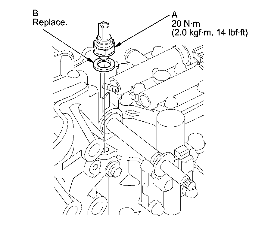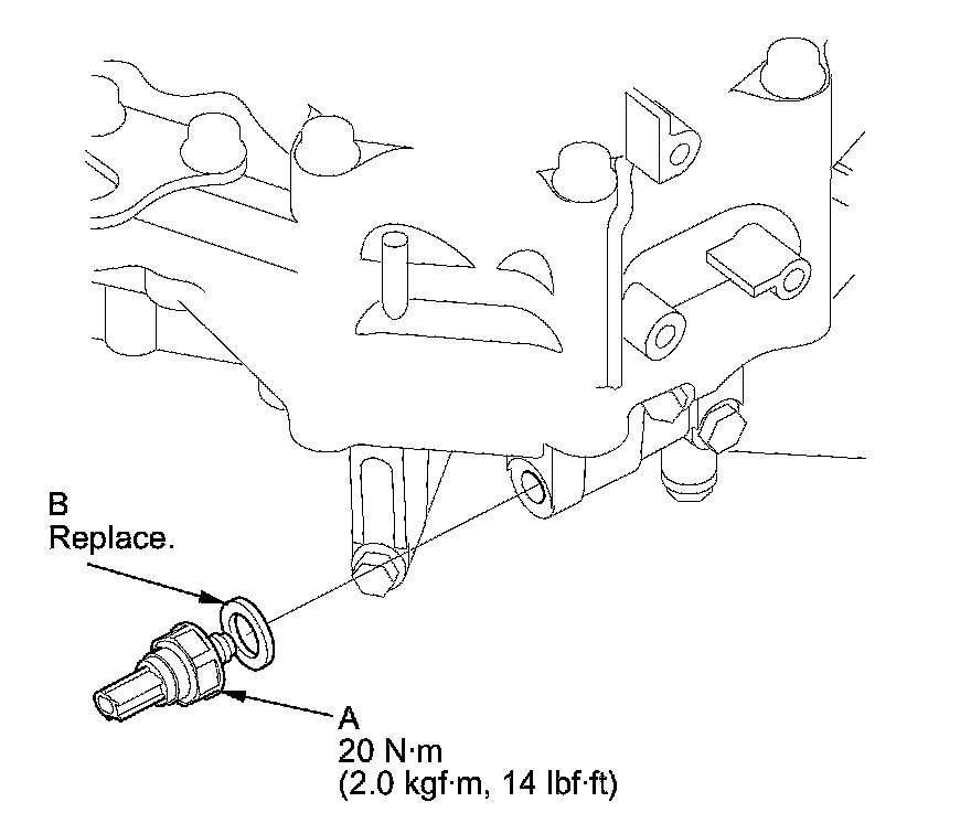 73. Install the transmission fluid pressure switch A (2nd clutch) (A) with a new sealing washer (B). Tighten the switch by gripping the metal part, not the plastic part.