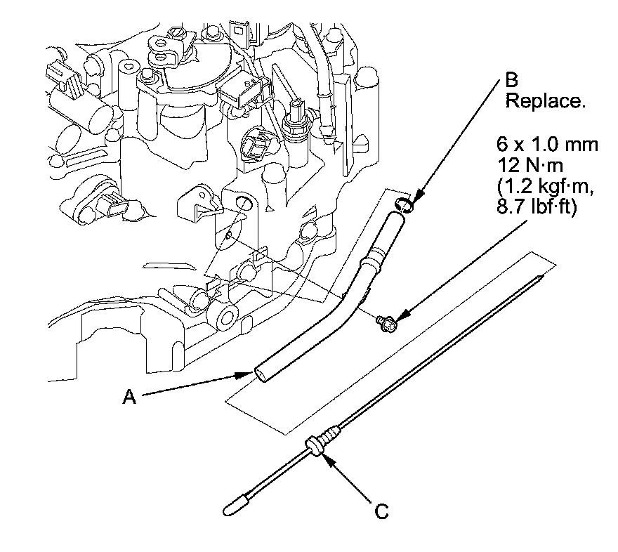 74. Install the ATF dipstick guide tube (A) with a new O-ring (B).