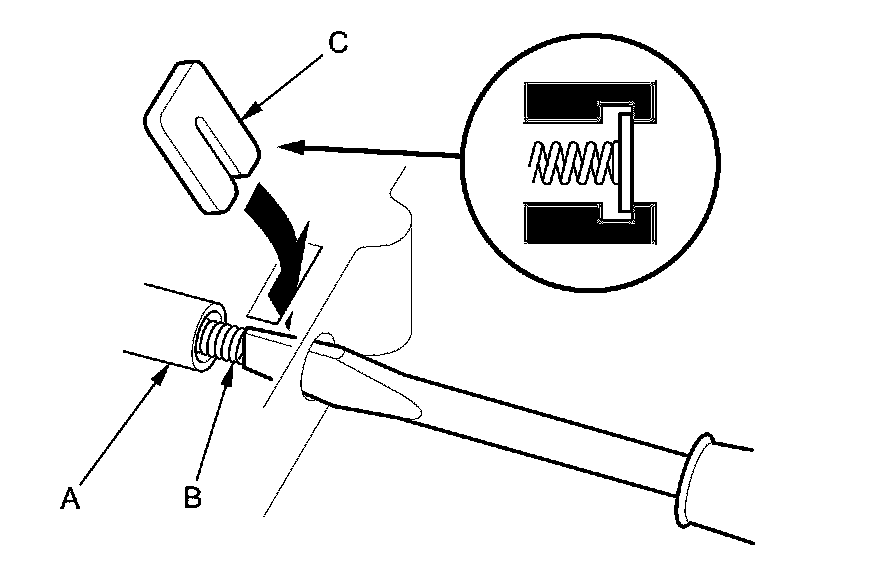 3. Install the valve (A) and the valve spring (B) in the valve body. Push the valve spring in using a screwdriver, then install the spring seat (C).