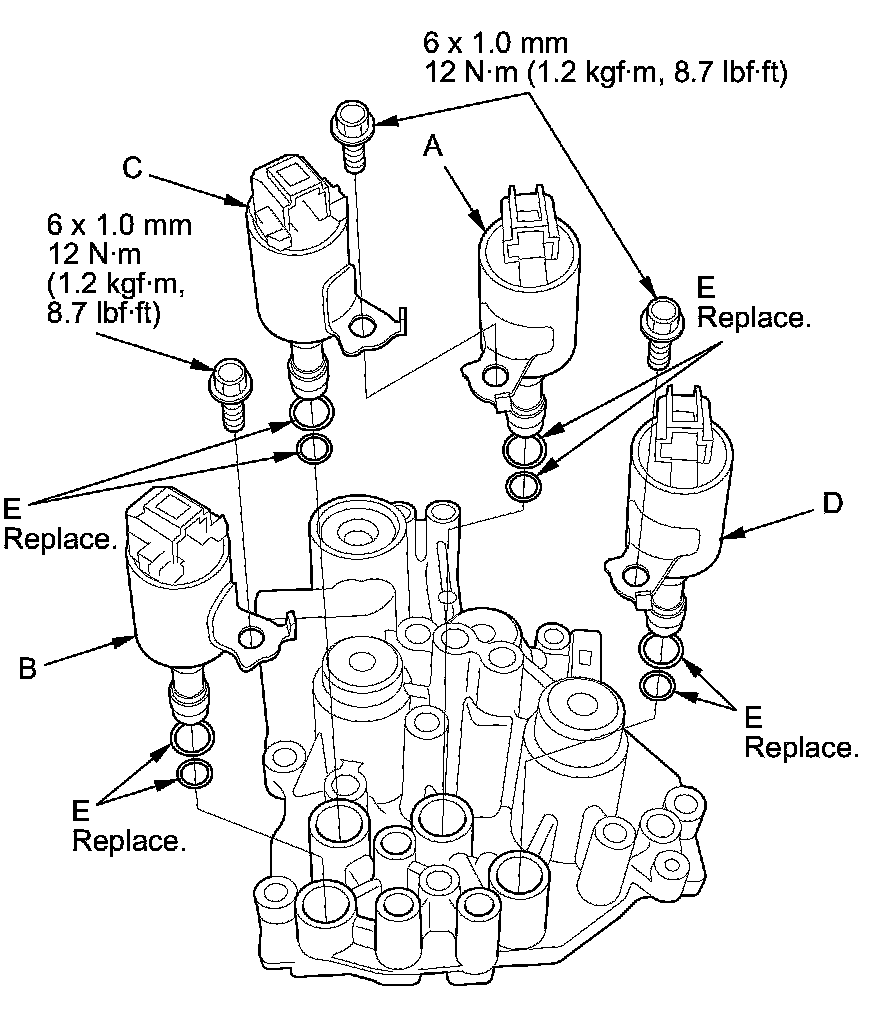 2. Install new O-rings (two O-rings per shift solenoid valve) (E) on each solenoid valves.