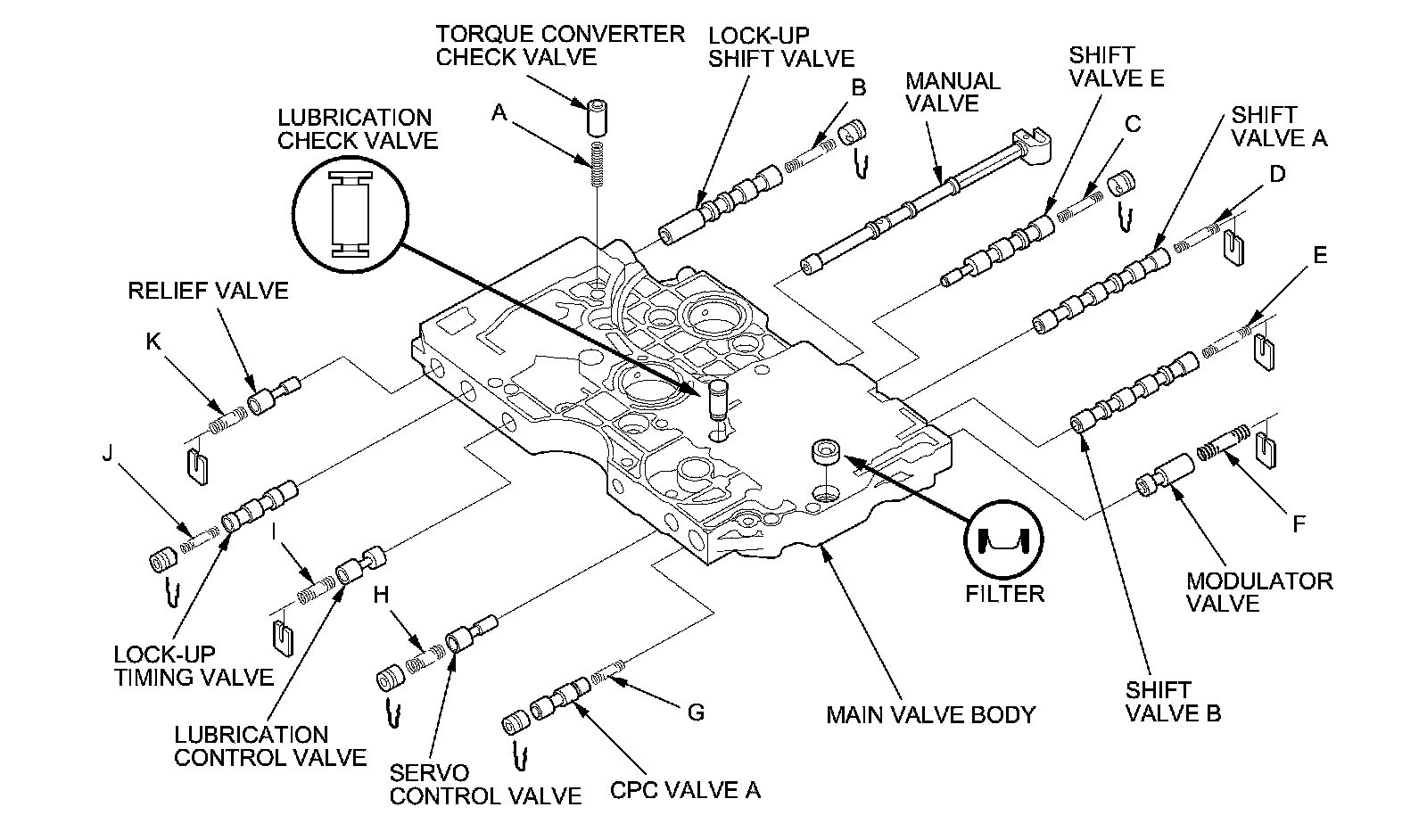3. Check all valves for free movement. If any fail to slide freely, refer to the valve body repair procedure Valve Body Repair.