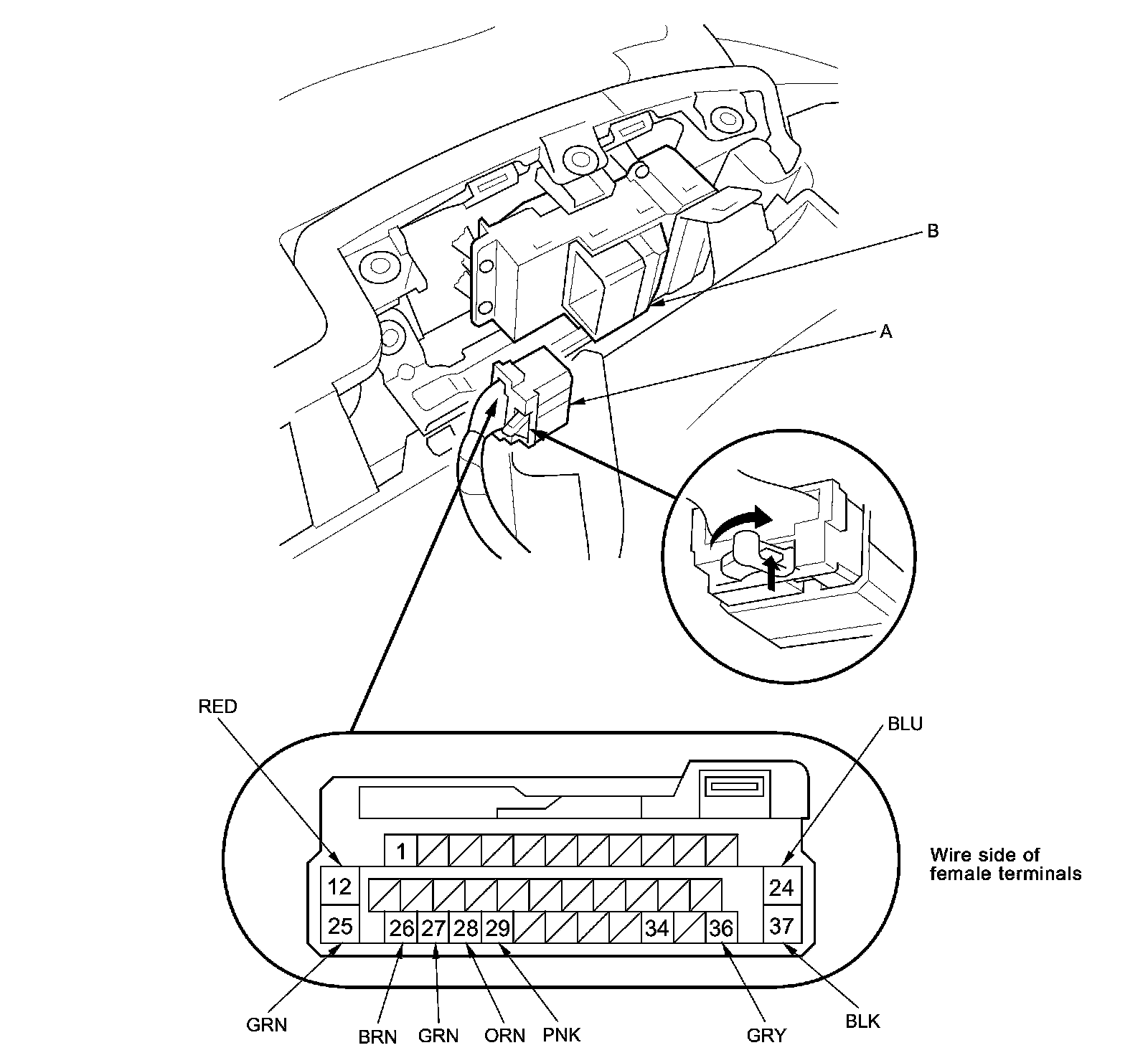 2. Disconnect the front passenger's power window switch 37P connector (A) from the front passenger's power window switch (B).