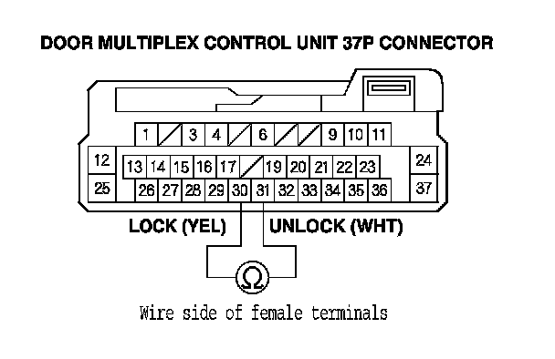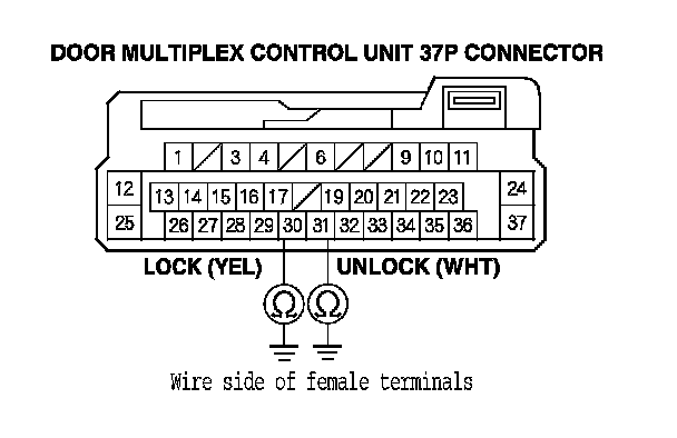 11. Check for continuity between body ground and door multiplex control unit 37P connector terminals No. 30 and No. 31 individually.