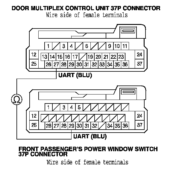 10. Check for continuity between door multiplex control unit 37P connector terminal No. 27 and front passenger's power window switch 37P connector terminal No. 29.