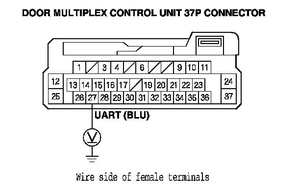 14. Measure the voltage between door multiplex control unit 37P connector terminal No. 27 and body ground.