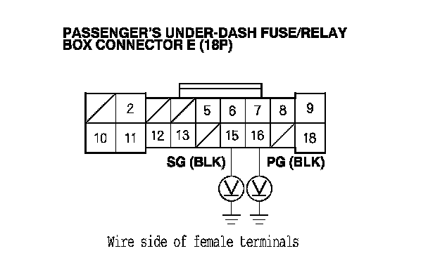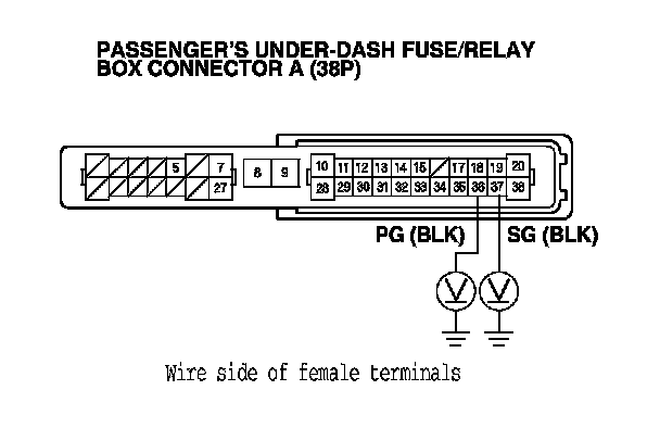 8. Measure the voltage between body ground and passenger's under-dash fuse/relay box connector A (38P) terminals No. 36 and No. 37, and between body ground and passenger's under-dash fuse/relay box connector E (18P) terminals No. 15 and No. 16 individually.