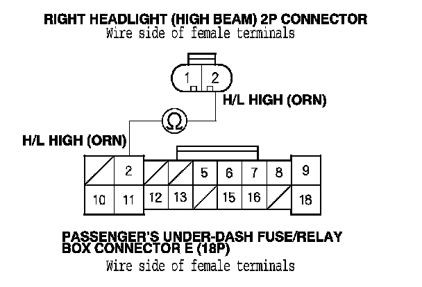 15. Check for continuity between passenger's under-dash fuse/relay box connector E (18P) terminal No. 2 and right headlight (high beam) 2P connector terminal No. 2.
