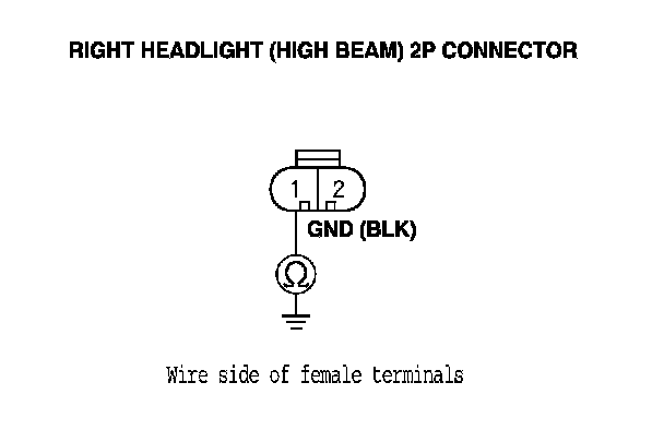 16. Check for continuity between right headlight (high beam) 2P connector terminal No. 1 and body ground.