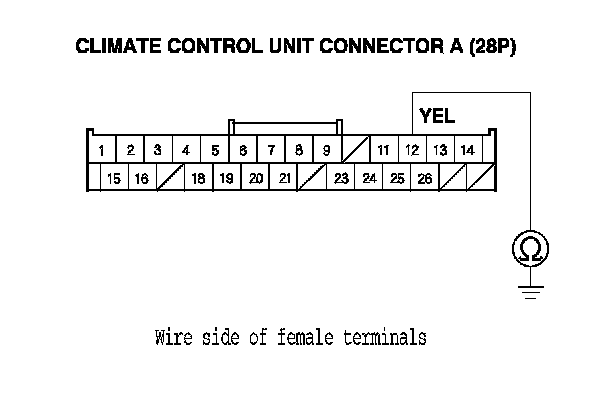 10. Check for continuity between body ground and climate control unit connector A (28P) terminal No. 12.