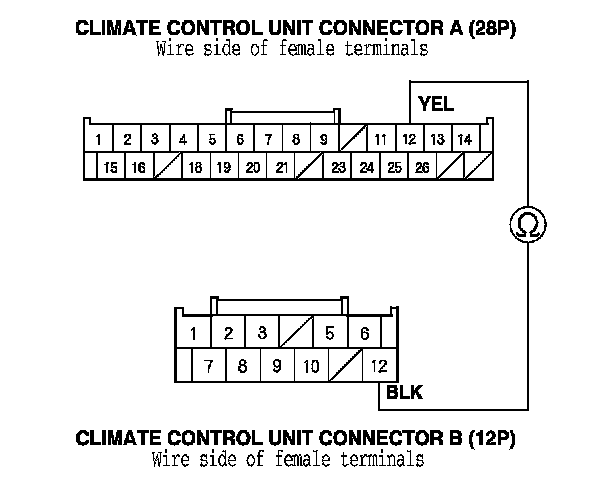 11. Check for continuity between climate control unit connector A (28P) terminal No. 12 and climate control unit connector B (12P) terminal No. 12.