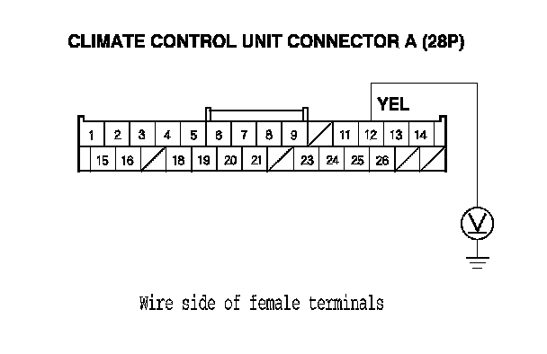 12. Turn the ignition switch to ON (II), and measure the voltage between climate control unit connector A (28P) terminal No. 12 and body ground.
