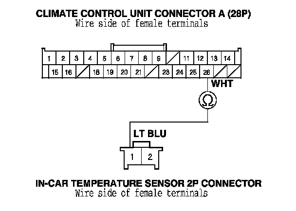 8. Check for continuity between climate control unit connector A (28P) terminal No. 26 and in-car temperature sensor 2P connector terminal No. 1.