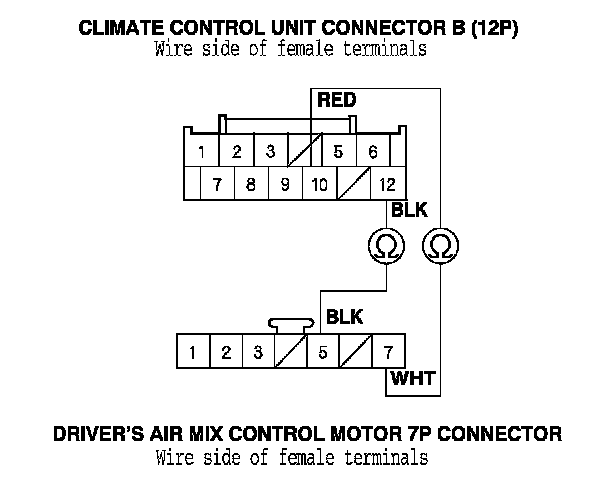 9. Check for continuity between the following terminals of climate control unit connectors A (28P), B (12P), and the driver's air mix control motor 7P connector.
