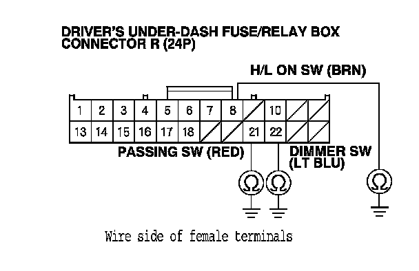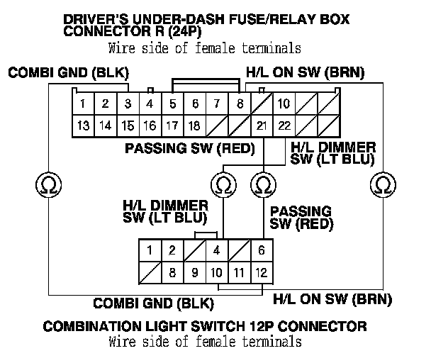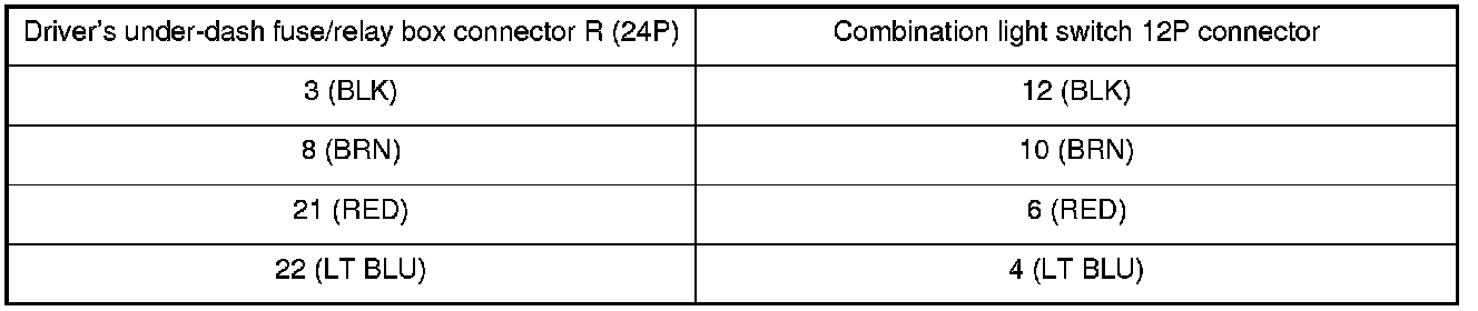 20. Check for continuity between driver's under-dash fuse/relay box connector R (24P) terminals and the combination light switch 12P connector terminals as shown: