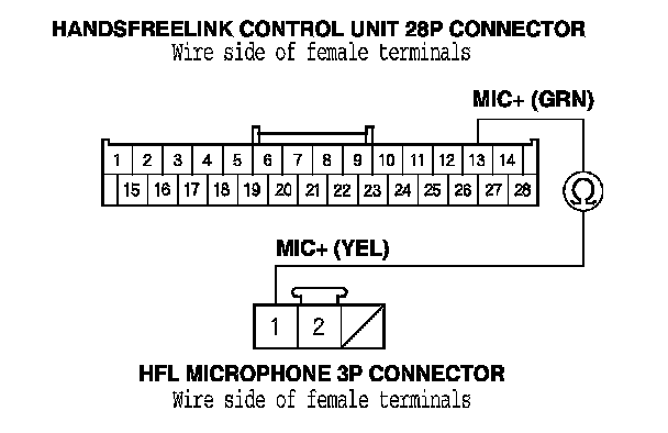 11. Check for continuity between HandsFreeLink control unit 28P connector terminal No. 13 and HFL microphone 3P connector terminal No. 1.