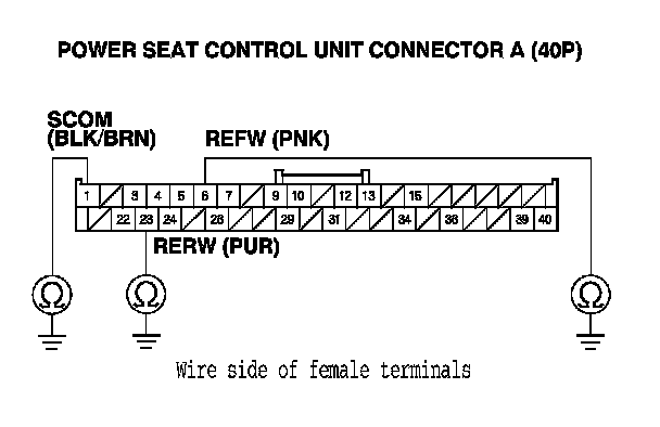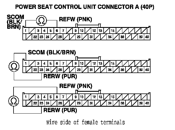9. Check for continuity between these power seat control unit connector A (40P) terminals: