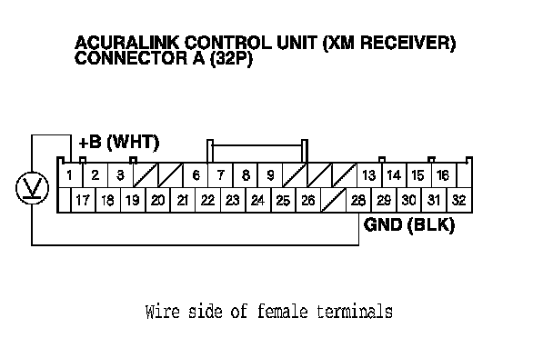 6. Measure the voltage between AcuraLink control unit (XM receiver) connector A (32P) terminals No. 1 and No. 28.