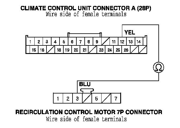 9. Check for continuity between the following terminals of climate control unit connectors A (28P), B (12P), and the recirculation control motor 7P connector.