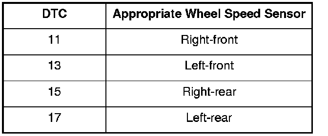 DTC 11, 13, 15, 17: Wheel Speed Sensor (Short to Power/Short to Body Ground/Open)