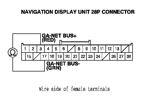 10. Check for continuity between navigation display unit 28P connector terminals No. 3 and No. 17.