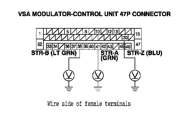 11. Measure the voltage between body ground and VSA modulator-control unit 47P connector terminals No. 30, No. 38, and No. 41 individually.