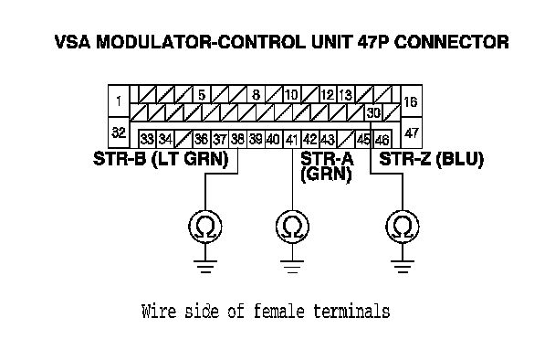 14. Check for continuity between body ground and VSA modulator-control unit 47P connector terminals No. 30, No. 38, and No. 41 individually.