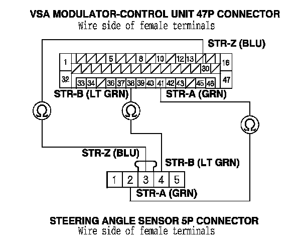NO - Intermittent failure, the system is OK at this time. Check for loose terminals between the steering angle sensor 5P connector and the VSA modulator-control unit 47P connector. Refer to intermittent failures troubleshooting. Reading and Clearing Diagnostic Trouble Codes