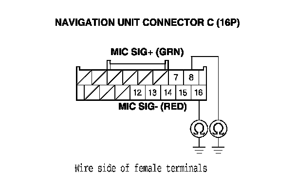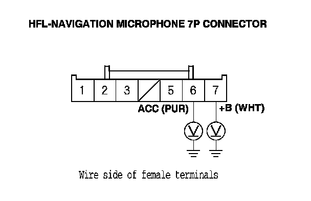 16. Measure the voltage between body ground and HFL-navigation microphone 7P connector terminals No. 6 and No. 7 individually.