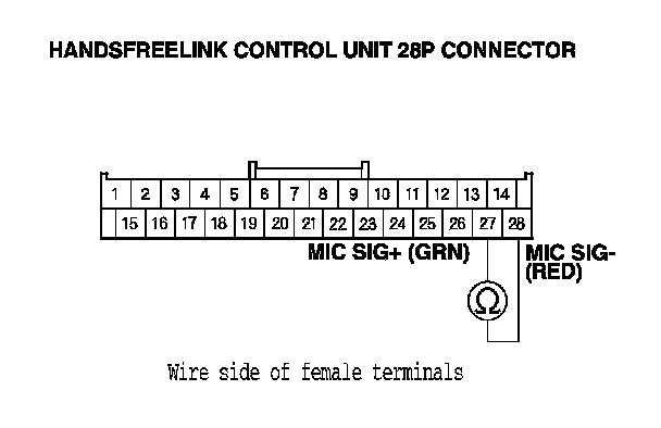 25. Check for continuity between HandsFreeLink control unit 28P connector terminals No. 27 and No. 28.