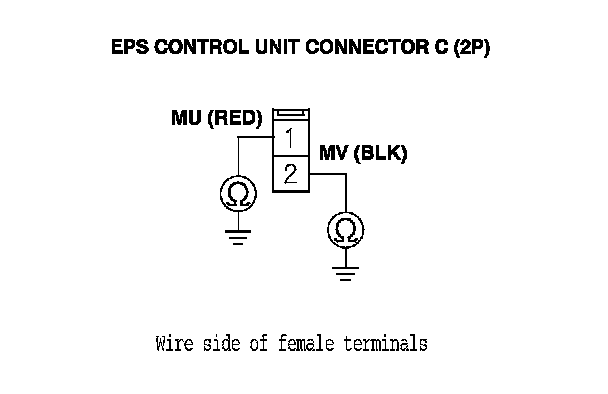 10. Check for continuity between body ground and EPS control unit connector B (2P) terminal No. 1, connector C (2P) terminal No. 1, and connector C (2P) terminal No. 2 individually.