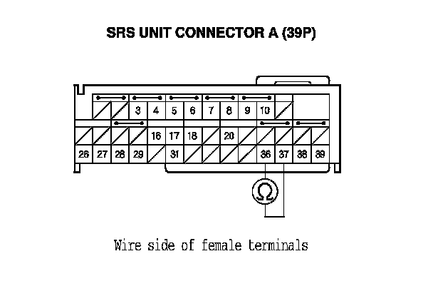 16. Measure the resistance between ground and SRS unit connector A (39P) terminals No. 36 and No. 37. There should be less than 1.0 Ohms.