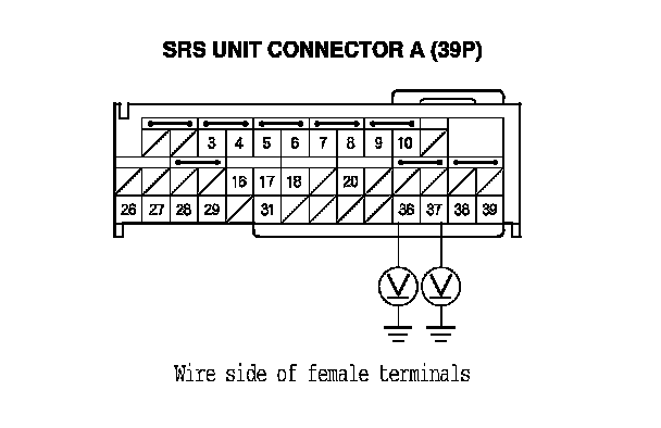 13. Measure the voltage between body ground and SRS unit connector A (39P) terminals No. 36 and No. 37 individually. There should be less than 0.2 V.