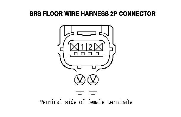 9. Measure the resistance between body ground and SRS floor wire harness 2P connector terminals No. 1 and No. 2, individually. There should be an open circuit or at least 1 MOhms.