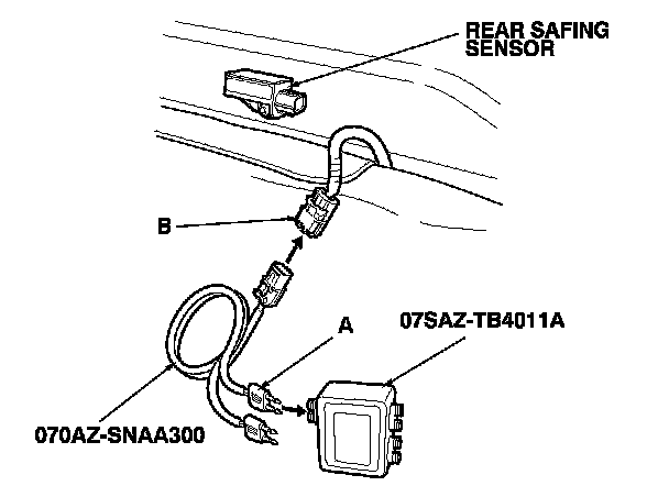 14. Connect the SRS inflator simulator (jumper connector) and the black lead (A) of simulator lead L to the SRS floor wire harness 4P connector (B).