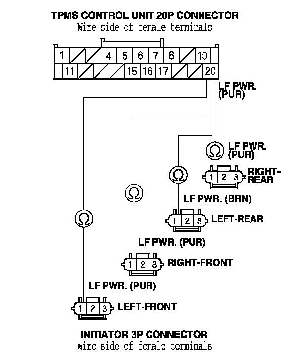 19. Check for continuity between TPMS control unit 20P connector terminal No. 20 and appropriate initiator 3P connector terminal No. 1.