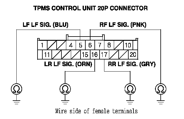 22. Check for continuity between body ground and the appropriate TPMS control unit 20P connector terminal.