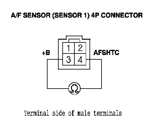10. At the sensor side, measure the resistance between A/F sensor (Sensor 1) 4P connector terminals No. 3 and No. 4.