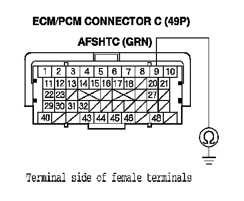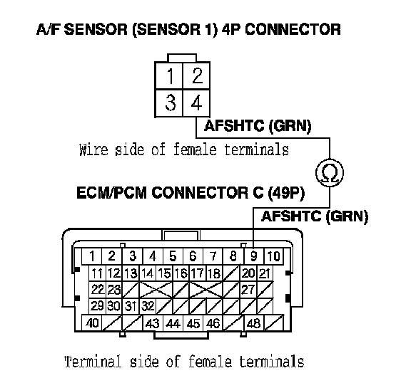 15. Check for continuity between A/F sensor (Sensor 1) 4P connector terminal No. 4 and ECM/PCM connector terminal C9.