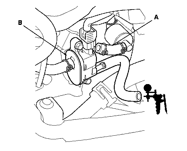 6. Disconnect the vacuum hose (A) from the purge valve (B) in the engine compartment, and connect a vacuum pump/gauge, 0-30 in.Hg, to the hose.