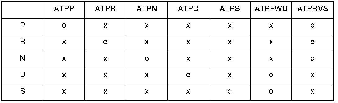 3. Compare the ATPP, ATPR, ATPN, ATPD, ATPS, ATPFWD, and ATPRVS inputs with the HDS to the following table in each shift lever position.