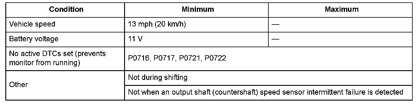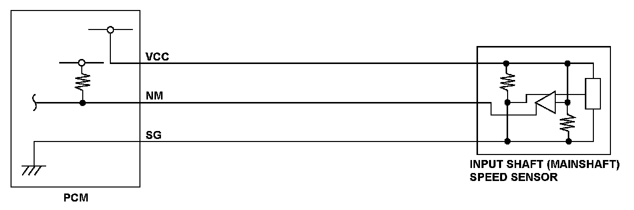 The input shaft (mainshaft) speed sensor is attached to the outside of the transmission housing. The input shaft (mainshaft) speed sensor generates a pulsing signal according to the speed of the idler gear on the input shaft (mainshaft). Using that signal, the powertrain control module (PCM) determines the speed of the input shaft (mainshaft). If no pulses occur with the input shaft (mainshaft) rotating, the PCM detects a malfunction that may be caused by an open, a temporary open, or a short to ground. Based on the fluctuation of the vehicle speed measured by the input shaft (mainshaft) speed sensor, a malfunction is detected and a DTC is stored.
