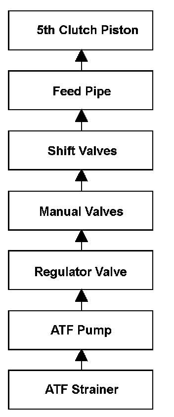 To engage 5th gear, line pressure is supplied to the 5th clutch piston, engaging the 5th clutch, and the input shaft (mainshaft) and the input shaft (mainshaft) 5th gear are connected and revolve together. Hydraulic pressure is supplied to the 5th clutch through the ATF strainer --> the ATF pump --> the regulator valve --> the manual valve --> the shift valves --> the feed pipe --> the 5th clutch piston. (A shift valve failure in the supply route above is detected by the malfunction detection of each shift solenoid valve.) The powertrain control module (PCM) computes the ratio of the input shaft (mainshaft) speed to the output shaft (countershaft) speed. When the ratio is not the 5th gear ratio, it is detected as a malfunction of the hydraulic circuit or the 5th clutch, and a DTC is stored.